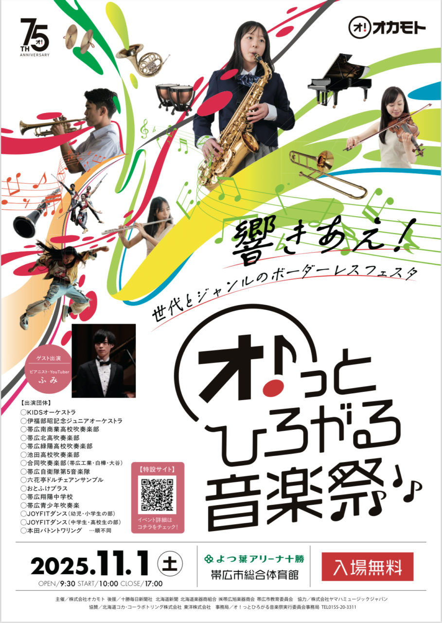 『株式会社オカモト75周年音楽イベント』僭越ながらゲストとして出演させていただきます。 地元の高校生の吹奏楽団の演奏をはじめとした1日中音楽を楽しめるイベントで